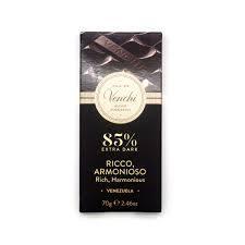 EXTRA TAMNA ČOKOLADA (KAKAO MASA: MIN. 85%). SASTOJCI BEZ GLUTENA: Venezuelanska kakao masa 79,5%, sirovi šećer, kakao maslac. MOŽE SADRŽAVATI TRAGOVE ORAŠASTIH PLODOVA, MLIJEKA I SOJE.